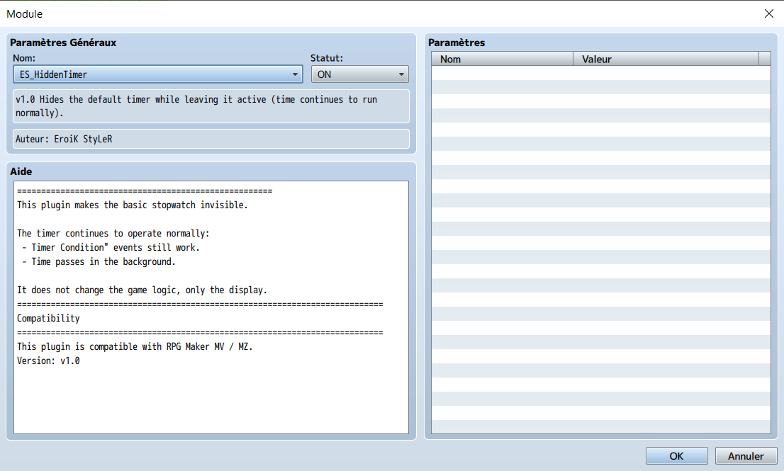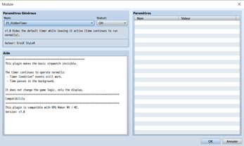 ES_HiddenTimer is a lightweight utility plugin for RPG Maker MV & MZ that hides the default on-screen timer, while still letting it run normally in the background.